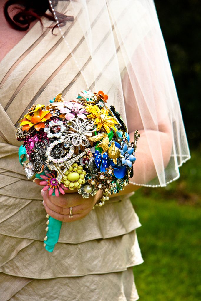 Um pouco mais sofisticado que a ideia anterior, mais ainda descontraído. O buquê de broches pode também carregar tradições, caso você o monte com peças de família.