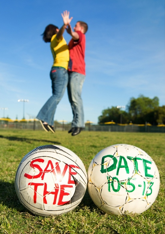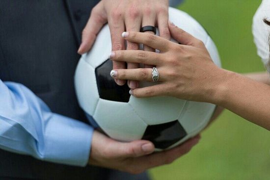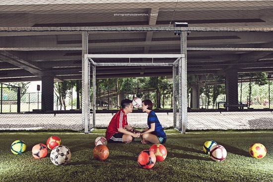 O ensaio de noivado pode ser temático. Nesse caso, basta um campinho de futebol, uma bola e muita descontração por parte dos noivos.